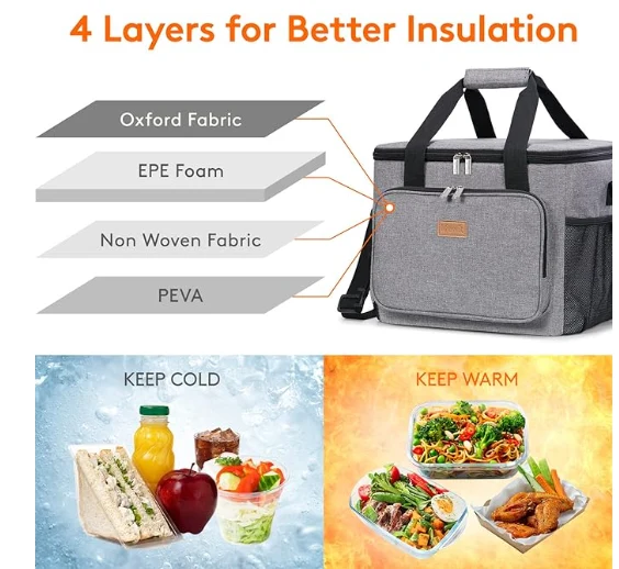 حقيبة نزهة معزولة ، حقيبة غداء مصنوعة من مواد معزولة يمكن أن تبقي الطعام والمشروبات باردة أو دافئة لأكثر من 5 ساعات. علاوة على ذلك ، فإن البطانة الداخلية مصنوعة من رقائق PEVA من الدرجة الغذائية حتى تتمكن من وضع طعامك في الحقيبة مباشرة دون أي قلق. توفر رغوة EPE المدمجة بحجم 6 مم حماية رائعة للحاويات والطعام والمشروبات.