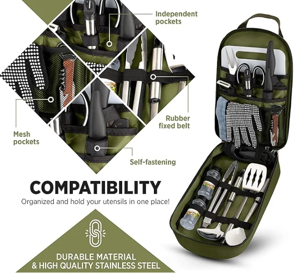 حقيبة أدوات التخييم في الهواء الطلق المحمولة ، تحتوي كل أواني على حقيبة مخصصة خاصة بها ، لذلك لا يتم تلطيخ الوحدات أو خدشها أو تضررت في التخزين أو في العبور. يوفر الوصول السهل إلى أواني الطهي الخاصة بك وهو مزود بختم مضغوط آمن