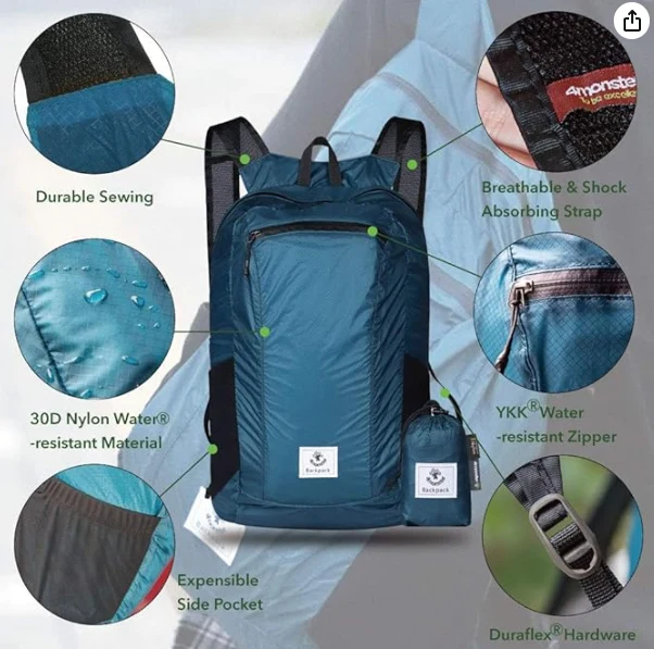 حقيبة ظهر للمشي لمسافات طويلة مضادة للماء ، حقيبة ظهر قابلة للطي توفر مساحة كافية للسفر في الهواء الطلق والتخييم والمشي لمسافات طويلة والرحلات اليومية والتسوق. يأتي مع جيب سحاب رئيسي وجيب سحاب أمامي وجيوب جانبية شبكية. 30 يوم لا عائدات متاعب / بورصة مجانية ، ضمان لمدة 12 شهرًا.